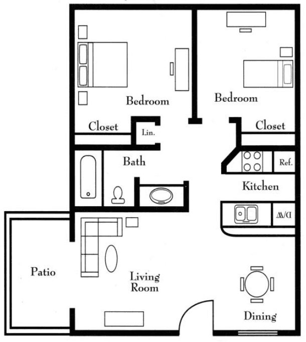Floor Plan 2 Bedroom 1 Bath. 750 Sq Ft.